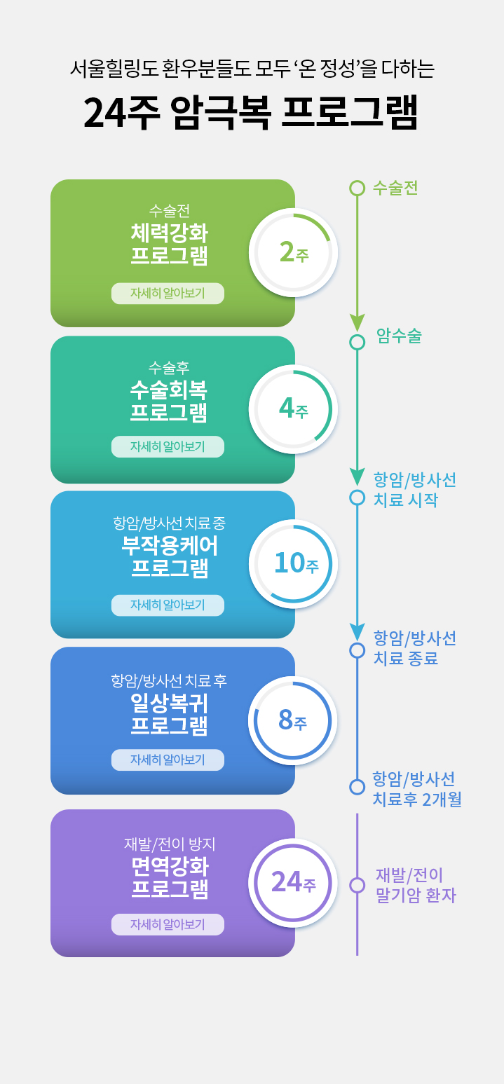 수술전 체력강화 프로그램, 자세히 알아보기 수술후 회복 프로그램, 자세히 알아보기 항암/방사선 치료 중 부작용케어 프로그램, 자세히 알아보기 항암/방사선 치료 후 일상복귀 프로그램, 자세히 알아보기 재발/전이 방지 면역강화 프로그램, 자세히 알아보기